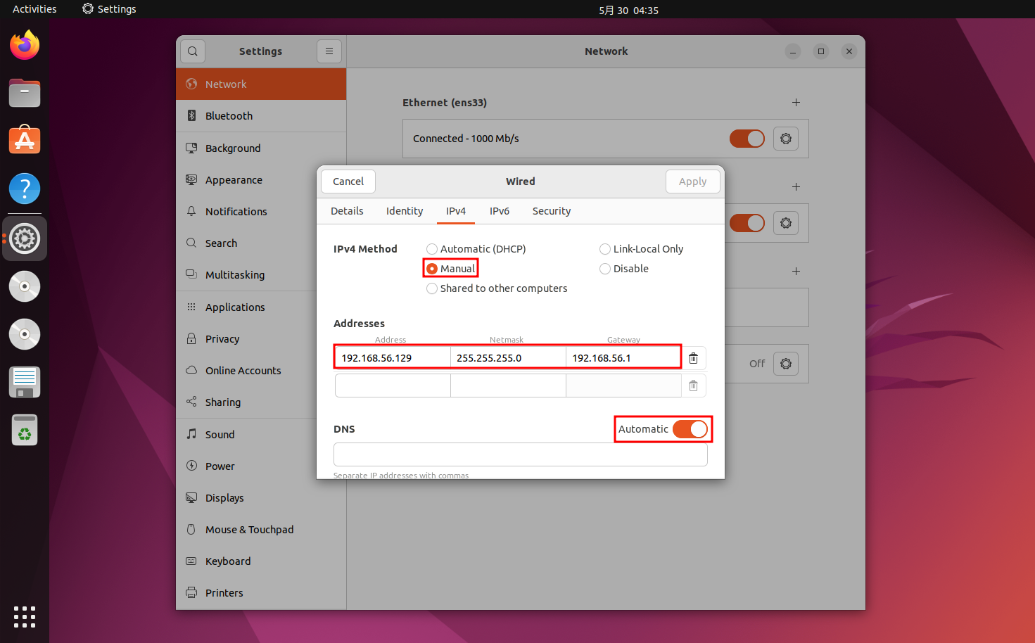 ネットワークアダプタが追加されたら Ubuntu の設定アプリを開き、Network > 歯車アイコン > IPv4 からIPアドレスを割り当てます。この際に GOAD VM とIPアドレスが被っていないことを確認してください。